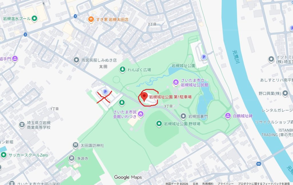 当初の集合場所は、岩槻城址公園 第2駐車場(市民会館北側の坂の下)になっていましたが、岩槻城址公園 第1駐車場に変更します。